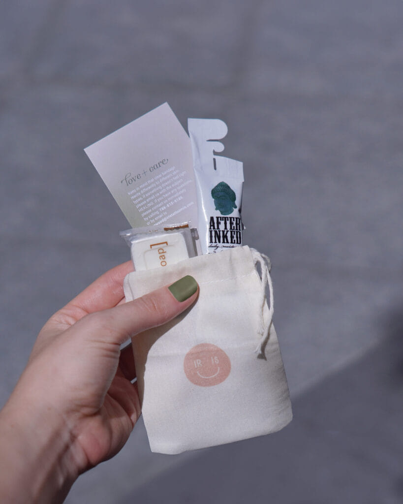 After 4-5 days with the Saniderm on, you can remove it under warm water. The Saniderm is a very sticky adhesive and some of the excess blood and ink may come off with the bandage making your skin look a bit wrinkly and discolored, but don’t panic, this is totally normal. You then wash and moisturize your new tattoo twice a day for at least 2 weeks. Here at Iris, we’ll provide you with an aftercare package that includes a non-fragrance soap and a lotion. Keep in mind that you don’t want to use anything that has a fragrance because these products usually contain alcohol and will overdry your tattoo.